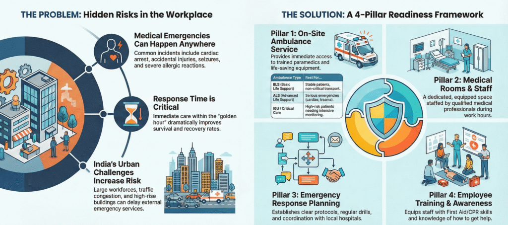 Medical emergencies can occur without warning, from sudden cardiac events and injuries to unforeseen health crises. The ability to respond swiftly and effectively can make the difference between life and loss, between a minor incident and a major disruption. For Indian offices where workforces are often large, diverse, and sometimes spread across expansive campuses having robust medical support is not just a best practice; it is a vital component of workplace safety, compliance, and employee wellbeing.